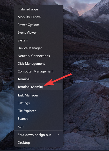 - Right-click the Start button, and choose Windows PowerShell (Admin), Command Prompt (Admin), or Terminal (Admin), depending on the exact OS version.