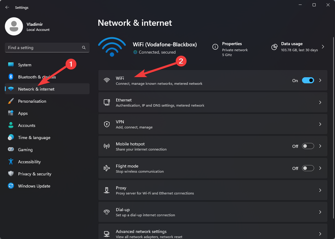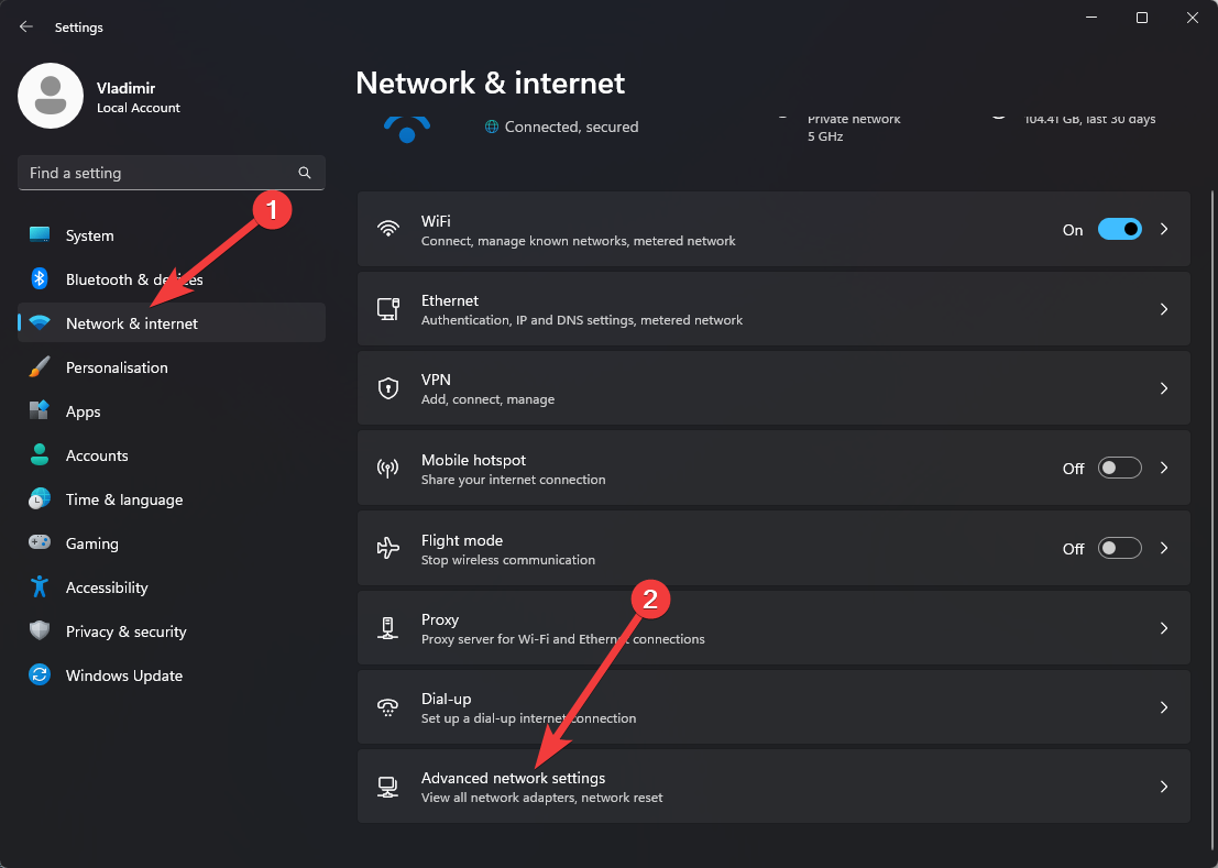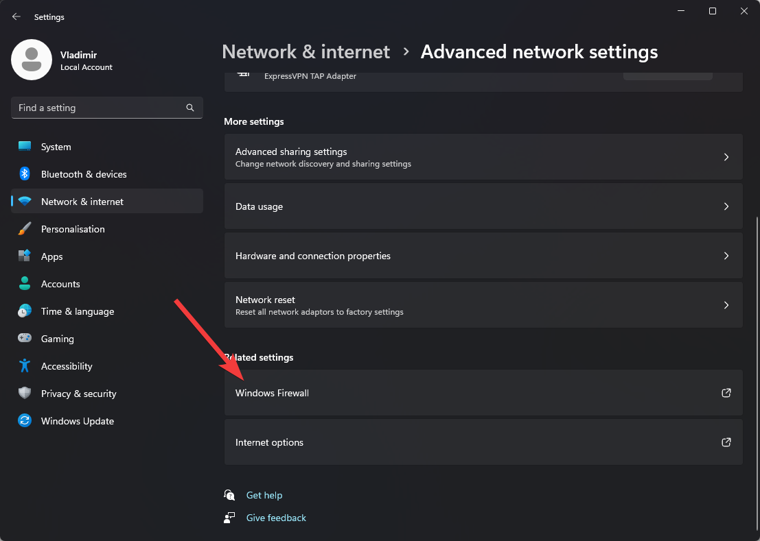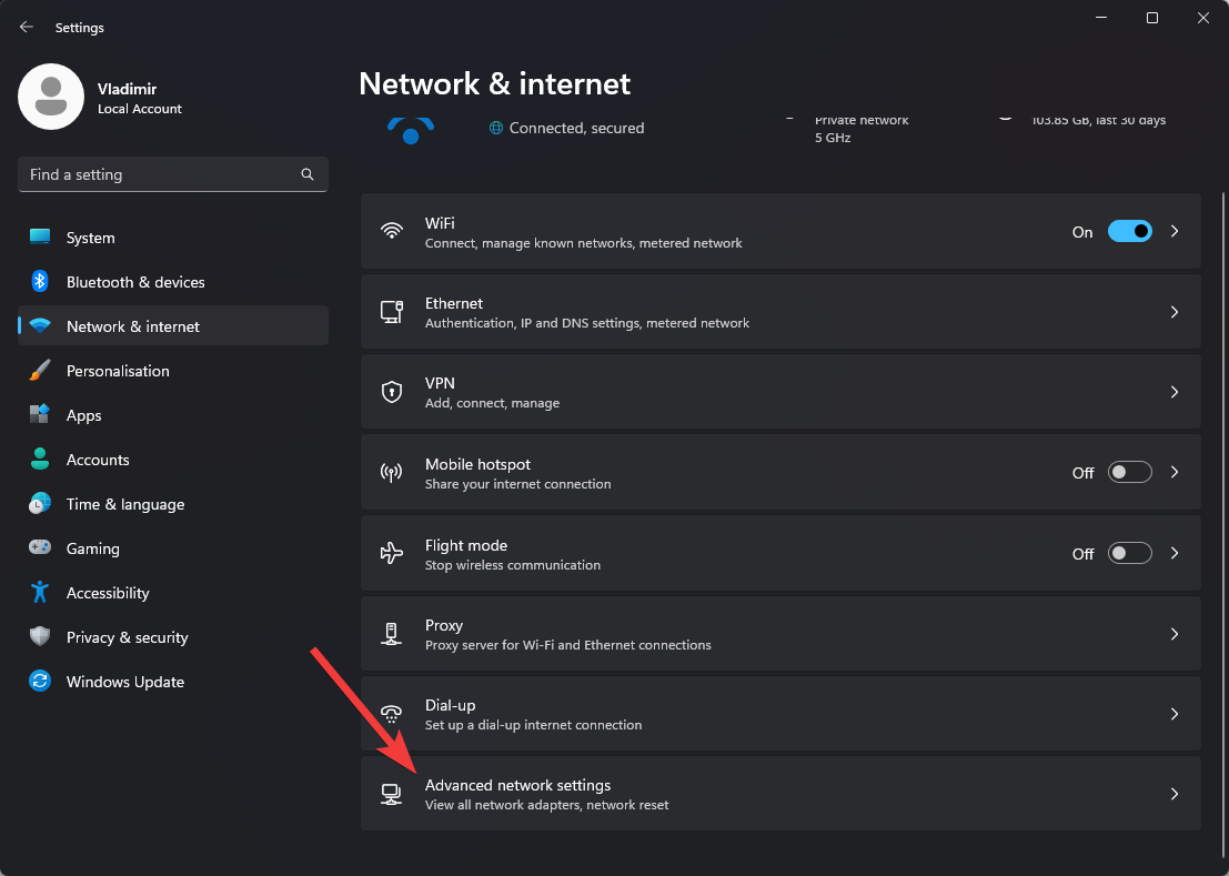- Choose Network & Internet, and open the Advanced Network Settings option.