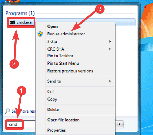 - Click Start, type cmd in the search box, right-click on Command Prompt, and choose Run as administrator.