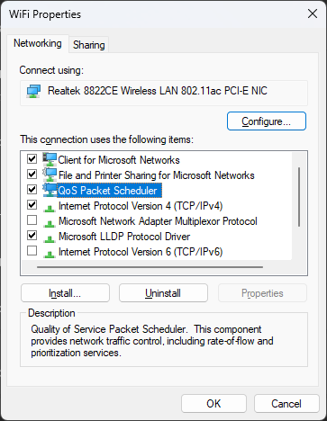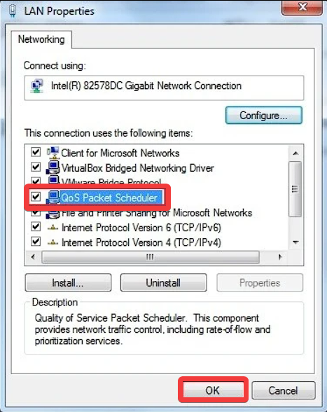 - Enable the option by checking the box next to QoS Packet Scheduler.