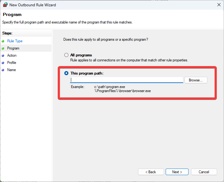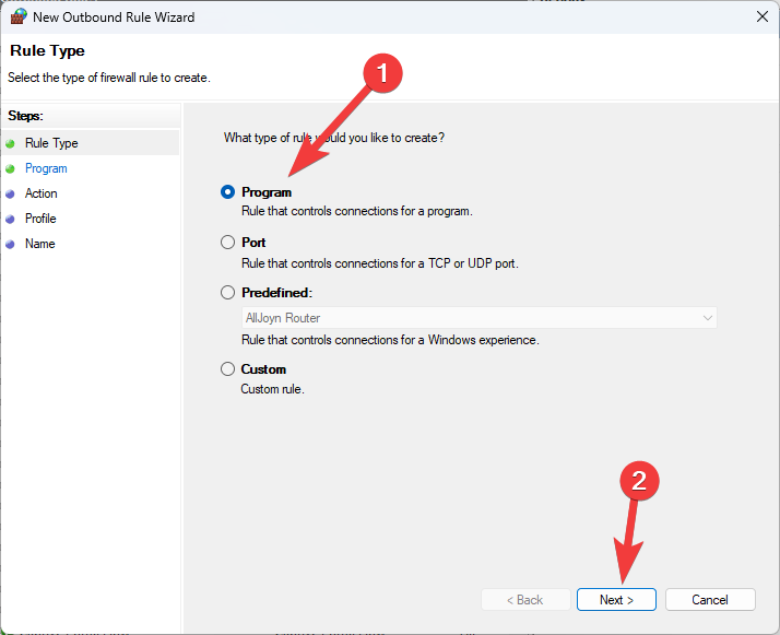 - Choose Program and click Next.