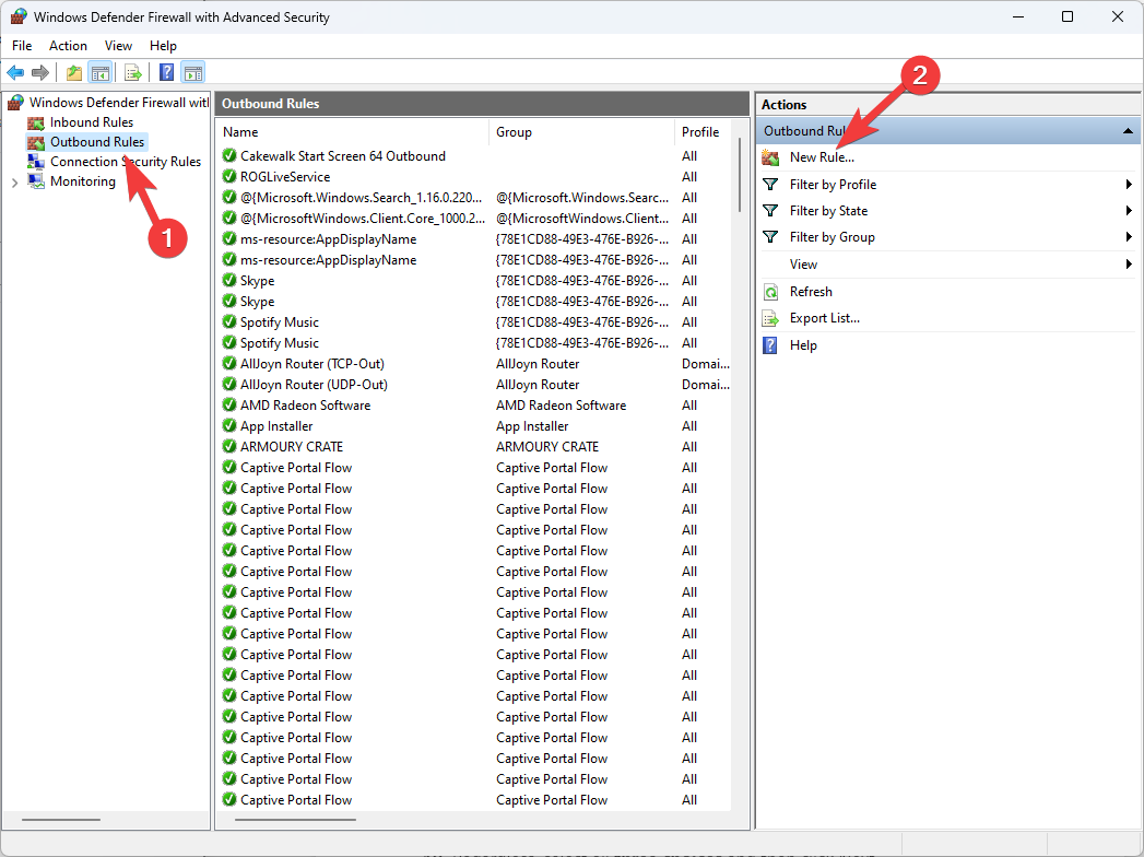 - Choose the Outbound Rules option from the left sidebar, and select New Rule from the right sidebar.