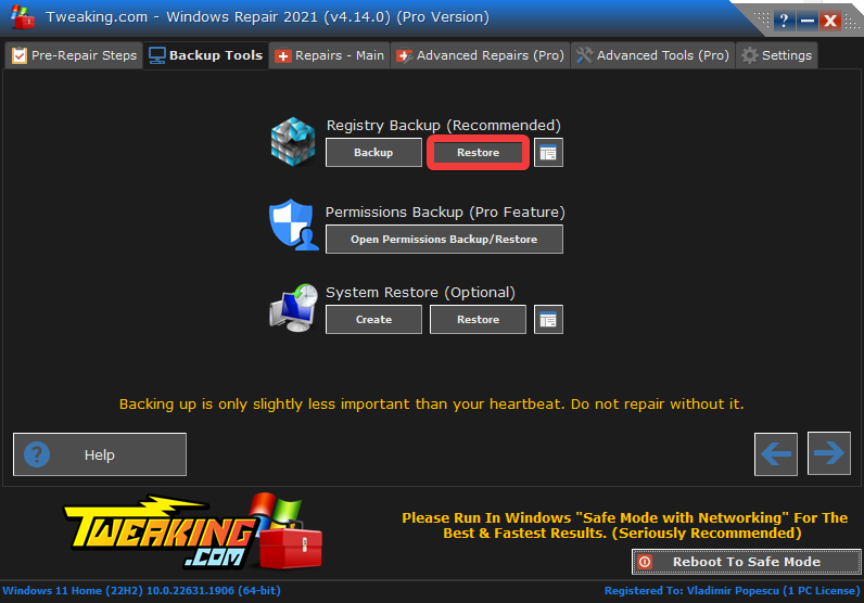- Open the Backup Tools tab, and press the Backup button under the Registry Backup section.