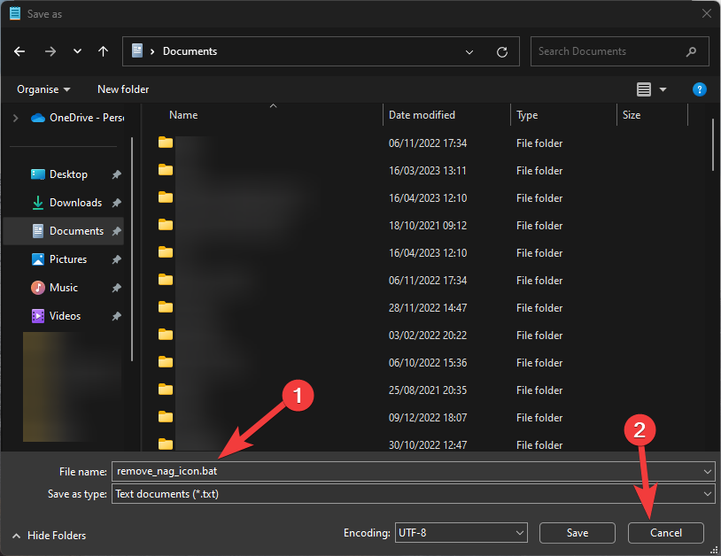 - Click the File menu, choose Save as, and type a name for the file while using a .bat format (e.g., remove_nag_icon.bat).