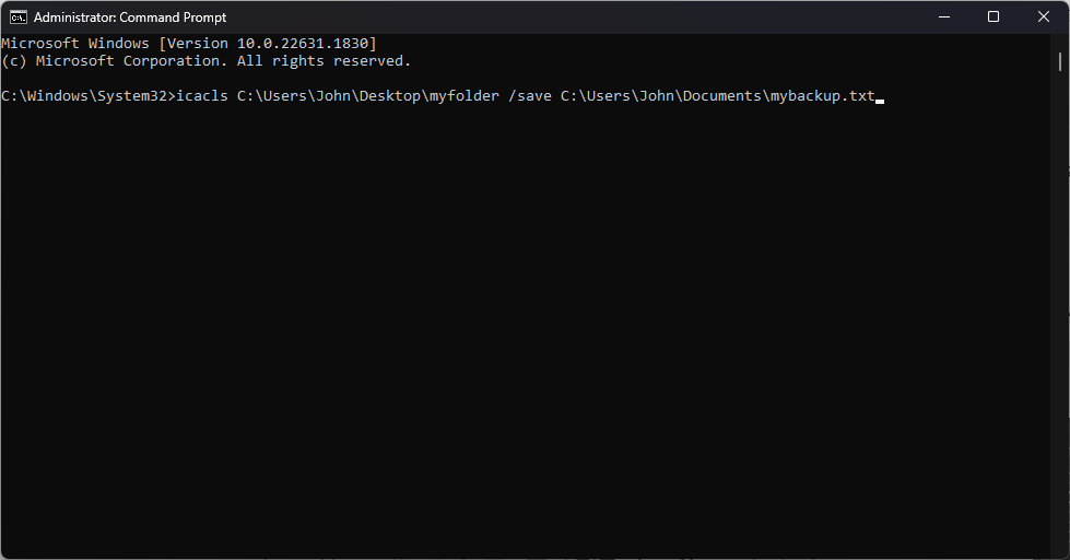 For example: icacls C:\Users\John\Desktop\myfolder /save C:\Users\John\Documents\mybackup.txt
