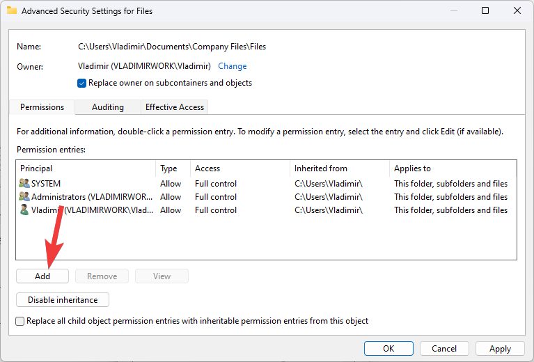 - Click Apply and then OK to close the Advanced Security Settings window.