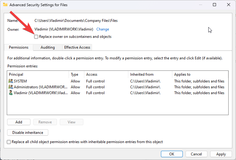 - In the Advanced Security Settings window, check the box next to Replace owner on subcontainers and objects.