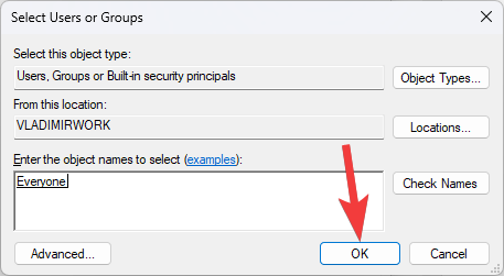 - In the Select Users or Groups window, type Everyone in the object name field and click Check Names. This will verify that the name is correct and underline it.