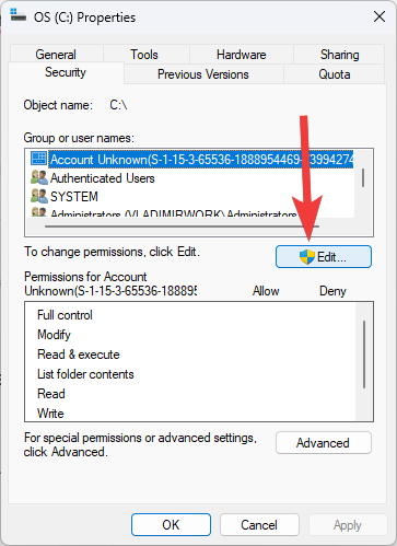 - Back in the Properties window, click the Edit button to modify the permissions.