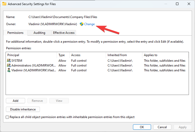 - In the Advanced Security Settings window, click on the Change link next to the Owner field.