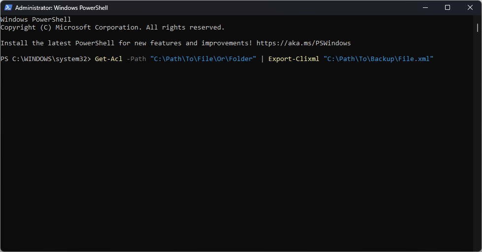 Replace “C:\Path\To\File\Or\Folder” with the path of the file or folder you want to backup, and “C:\Path\To\Backup\File.xml” with the path and name of the backup file you want to create.