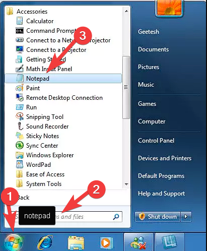 - Open a new Notepad file by searching it in the Start menu.