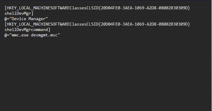 [HKEY_LOCAL_MACHINESOFTWAREClassesCLSID{20D04FE0-3AEA-1069-A2D8-08002B30309D}shellDevMgrcommand]