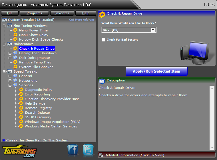 - Major program change. In the previous versions, you could only run one tweak at a time. Now you can select the tweaks you want and apply them all at once.