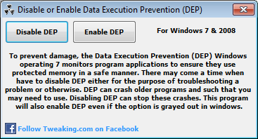 Disable or Enable Data Execution Prevention (DEP) will allow a user to turn DEP on or off easily. DEP can cause some programs to crash, so you may need to turn it off. As a plus, you can still enable DEP with this tool for a system where Windows grays out DEP. DEP will still be grayed out, but it will be working.