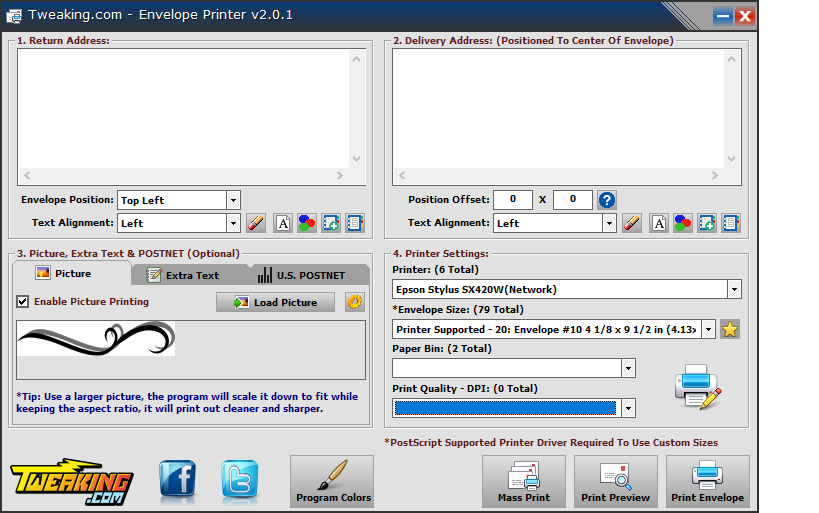 I downloaded and installed this, but it prints the envelopes blank. There's no printer setup and I cant set the DPI - it won't let me.